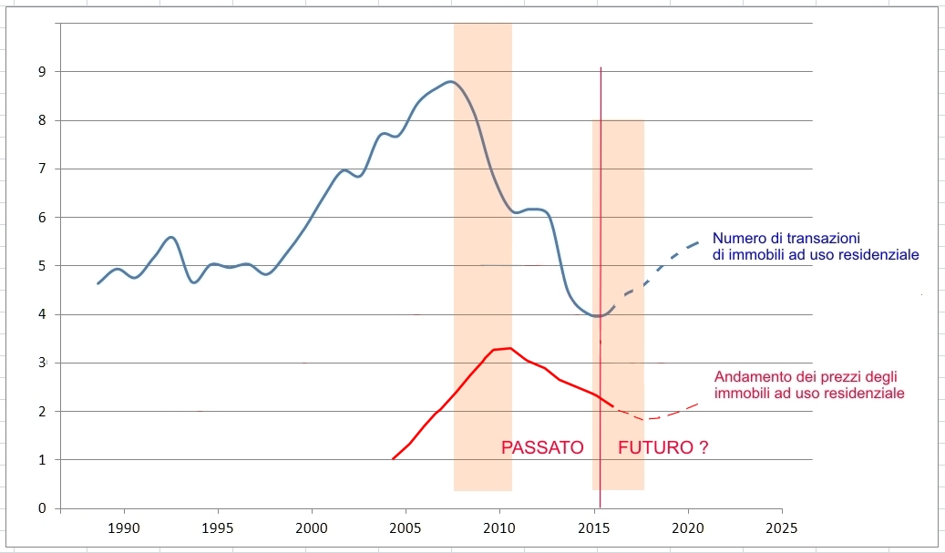Fare previsioni sull’andamento dei prezzi degli immobili, anche solo per il prossimo futuro, può certamente apparire un po’ presuntuoso. E’ anche vero però che di una mia previsione il consumatore può farne ciò che vuole ed inoltre se nessuno la facesse non esisterebbero punti di riferimento per poter prendere delle decisioni su come comportarsi in questo particolare mercato. Se quindi accettiamo il concetto che qualcuno la deve pur fare, penso allora che sia bene che le faccia chi da tanti anni in questo mercato ci lavora, tenendo sempre presente che in qualsiasi momento le cose possono certamente cambiare sia per Volere Divino che governativo. Occorre intanto capire bene che il mercato immobiliare non può, ovviamente, avere oscillazioni rapide in quanto la normale operazione di compravendita richiede, mediamente, mesi e la decisione se farla o non farla magari, addirittura, anni. I prezzi delle case quindi non hanno certo la volatilità dei prezzi delle azioni che, in pochi minuti, passano di mano anche decine di volte. Detto questo abbiamo assistito nei decenni passati (direi dal dopo guerra in poi) ad un progressivo e quasi costante aumento dei prezzi degli immobili, con solo pochi momenti di stagnazione o brevi periodi di leggero calo. Questo continuo aumento dei prezzi degli immobili in Italia è stato così duraturo e, apparentemente, praticamente inarrestabile che ha generato un vero e proprio luogo comune circa la solidità dell’investimento in questo mercato. Per stare tranquillo, ed essere certo di investire bene i propri soldi, l’italiano medio, per quasi 60 anni, ha seguito una strada maestra: investire nel mattone! Tutto sembrava andare a gonfie vele sin quando, un bel giorno, tre fattori, tutti altamente negativi, si sono sommati nello stesso momento, come una grande congiunzione astronomica, l’uno insieme all’altro, facendo crollare (almeno momentaneamente) questo mito. I tre fattori sono stati questi: il dramma della crisi finanziaria nata dai mutui e prestiti subprime negli Stati Uniti, che ha portato al blocco delle erogazioni dei mutui anche in Italia; la bolla dei prezzi degli immobili in Italia, che erano lievitati a dismisura rispetto agli introiti della famiglia media italiana; l’incredibile (ed anche assurdo) accanimento fiscale sui beni immobili, scatenato da tutti gli ultimi governi ed andato sempre più in crescendo, fino (e più che mai!) all’attuale governo compreso! Cosa potrebbe succedere d’ora in avanti? Potrebbe succedere che le banche ricomincino pian piano a fare quello per cui sono nate e cioè raccogliere denaro per poi finanziare privati ed aziende (e non solo per guadagnare loro e salvarsi così dal fallimento certo, come hanno fatto negli ultimi anni). Se lo faranno non crediate comunque che sarà stata una loro iniziativa (a loro andava benissimo continuare così!) è solo perché qualcuno, più potente di loro, glielo avrà imposto. Potrebbe succedere poi che dopo tanti anni di fermo alle compravendite (ormai quasi 7) le famiglie siano oggi nella necessità oggettiva di dover cambiare casa per sopravvenute esigenze (nascite, morti, separazioni, ecc.) e si voglia tentare quindi qualche nuovo acquisto, approfittando dell’eccezionale calo dei prezzi (si parla di -30% di media dal 2010 ad oggi!). Infine potrebbe succedere che qualcuno al governo, pur sapendo bene di dover continuare a spremerci per poter mantenere inalterati i loro stipendi e le loro pensioni, rifletta sul fatto che forse sarebbe il momento di allentare veramente (e non solo a parole) la stretta fiscale sugli immobili che, di fatto, è oggi il più potente freno alla ripresa. Ricordiamoci infatti che se l’IMU e tutte le altre gabelle limitano le compravendite delle prime case, inibiscono quasi totalmente quelle delle seconde, con la conseguenza diretta che, bloccando il mercato immobiliare in genere, si blocca una serie di mercati satelliti, che orbitano intorno a questo mondo, e che fra tutti costituiscono forse la maggior percentuale del PIL Italiano. Detto questo, e siamo stati molto ottimisti, potrebbe esserci a breve una leggera ripresa delle transazioni immobiliari. Ed i prezzi allora cosa faranno? Come detto all’inizio, la reazione non potrà essere immediata. Molte vendite continueranno ed essere fatte più per necessità che per piacere. Rate di mutuo troppo alte da pagare, commercianti e piccoli imprenditori costretti a vendere per immettere liquidità nelle loro imprese, spese annuali di gestione e tasse non più sostenibili per chi magari ha perso il lavoro o per chi ha una pensione modesta, ecc. ecc.. Le compravendite potrebbero quindi aumentare nel breve periodo, ma il mercato non potrà comunque accorgersene subito e di conseguenza non potrà reagire se non dopo qualche tempo. L’esempio analogo, ma contrario, lo possiamo infatti riscontrare valutando il periodo iniziale di questa crisi, che può essere facilmente visualizzato nel grafico qui sotto, guardando l’andamento delle due curve all’interno dei due rettangoli arancioni.